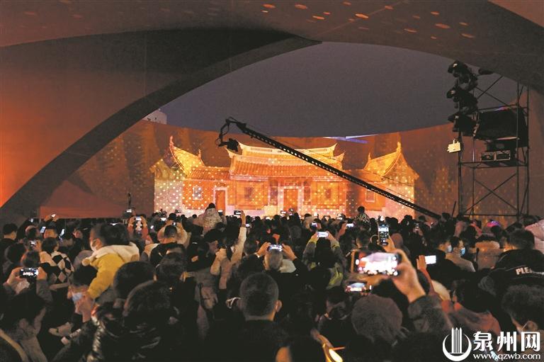 晚上7时许,此次活动的重头戏之一——全息裸眼3D首秀仪式上演。“四朵金花”的“花蕊”墙体上缓缓展现了本次活动的视觉盛宴。此次全息裸眼3D播放用时6分钟左右,分为三个篇章。第一篇章“千年刺桐”,讲述泉州历史;第二篇章“世遗泉州”,展示泉州老君岩、东西塔等知名遗产点和景点风貌;第三篇章“数字未来”,将数字科技与未来进行无限畅想。现场观众通过音乐、音效,感受沉浸式的视觉体验。