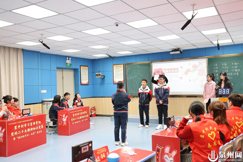 “开始抢答!”在国光中学初中部录播室里,参赛选手的手齐刷刷举起、争先恐后。在党的二十大精神知识竞赛环节,蓉中村“情暖故里”大学生志愿服务队与国光中学初中部和高中部的18名选手组成6组参赛队,每组3人,现场角逐比拼、同台竞技,参赛者反应迅速、主动抢答,比分你追我赶,精彩的竞答不时引发后场同学们阵阵掌声。据悉,知识竞赛内容涵盖党的二十大知识、党史、思政教育、蓉中村情和传统文化知识等,经过激烈比拼,评比出一、二、三等奖。