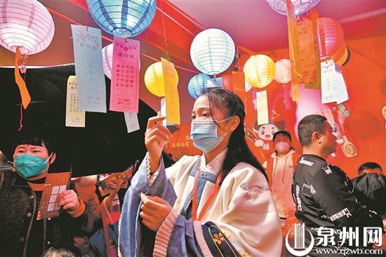游客在花灯展上猜灯谜