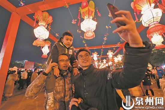 群众在“灯耀泉港”元宵花灯展上合影留念。