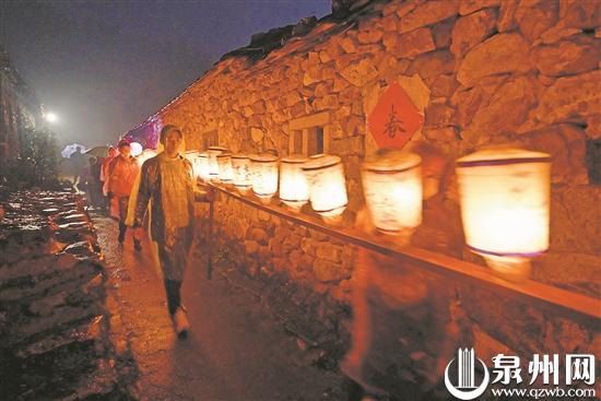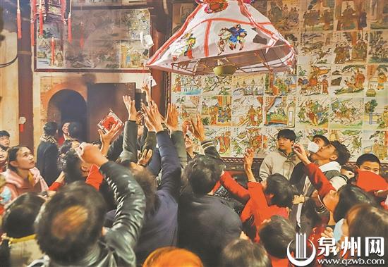 2月5日晚,在后龙镇涂坑村白石宫,源于明清时期的走马灯传统为元宵佳节添彩助兴。一场新年“走马灯接福”比赛在白石宫内举行。随着走马灯缓缓旋转,寓意喜庆幸福、丁财两旺、五谷丰登的红纸落下,灯下人群纷纷伸手“接福”,祈求一年好运吉祥。 (洪泽坤 郭菲凡/文 照片除署名外均为洪泽坤摄)