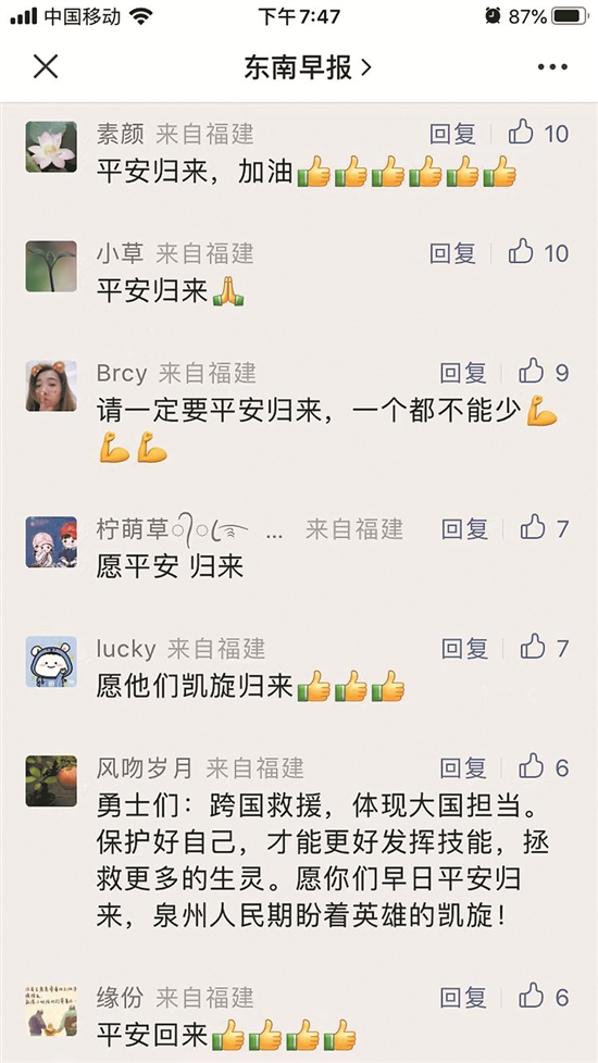 “勇士们,跨国救援体现大国担当。保护好自己,才能更好发挥技能,拯救更多的生灵。愿你们平安归来。”“一方有难,八方支援,泉州的蓝天救援队好样的!”“逆行者,祝你们平安归来。”“向勇士们致敬,平安归来,为你们感到骄傲。”……泉州驰援土耳其的救援队员跨国救援,身在国内的亲友、网友万分牵挂,纷纷留言对“逆行者”的勇敢行为点赞,同时也祝福他们顺利完成救援任务,平安归来。