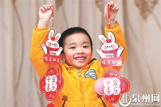 家在泉州的小柏霖看到家里买的兔年吉祥挂饰开心不已(陈起拓 摄)