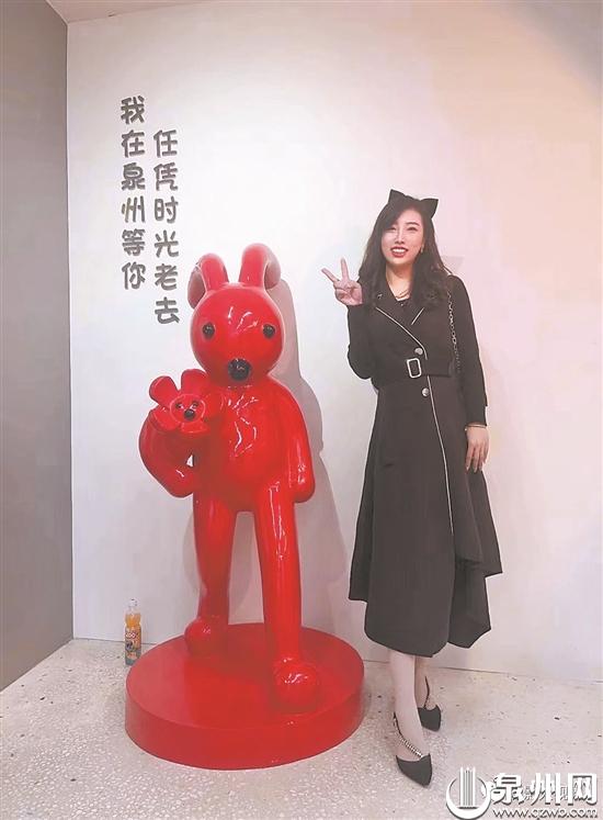 在中山路中山驿馆《城市影像馆》,市民正在馆内的网红打卡点与兔子雕塑合影。(吴宗宝 摄)