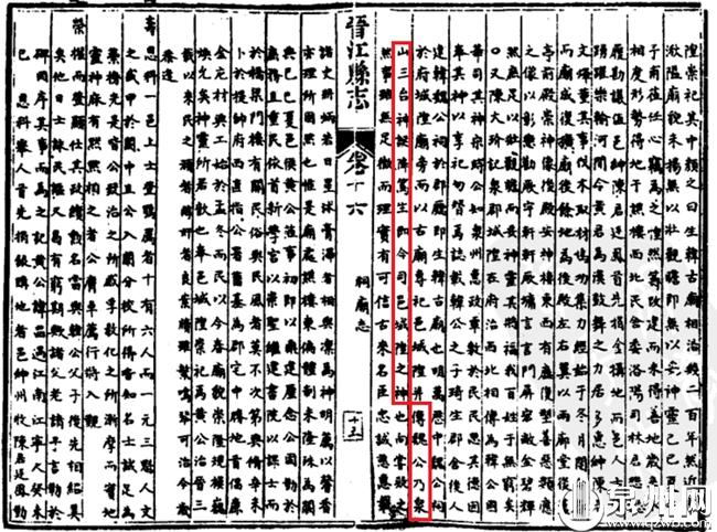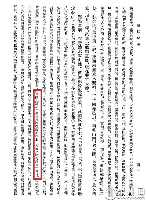 清道光《晋江县志》韩琦司县城隍之神的记载(林建强 提供)