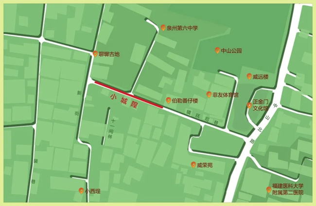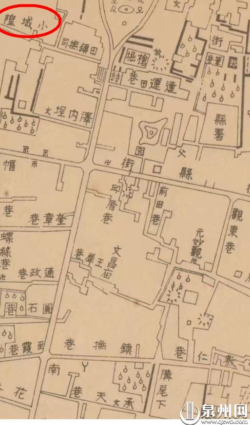 小城隍巷位于中山北路威远楼广场西向,为东西走向,与镇抚司巷重叠,西连新街巷。清代晋江县城隍庙(民间俗称“小城隍”)建于此巷,与民间所称“大城隍”——泉州府城隍庙(即今北门新村小学)相对应;后改建为私立泉州中学校校舍(今改名泉州第六中学,今泉州市小城隍庙巷2号),因庙得巷名,庙虽废,名尚存。