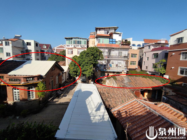 左边划圈处为新街54号,居民介绍,曾为林家大厝内池塘、假山、戏台所在地;右边为十一间林巷14号,以前林家祖厅设在这里。