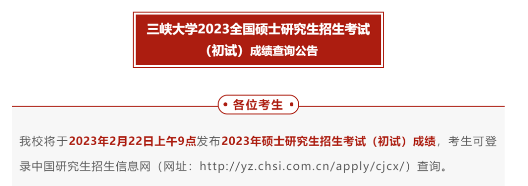 三峡大学将于2023年2月22日上午9点发布2023年硕士研究生招生考试(初试)成绩。成绩复核申请时间为2023年2月23日-24日,08:00-12:00,14:30-17:00,逾期不再受理。