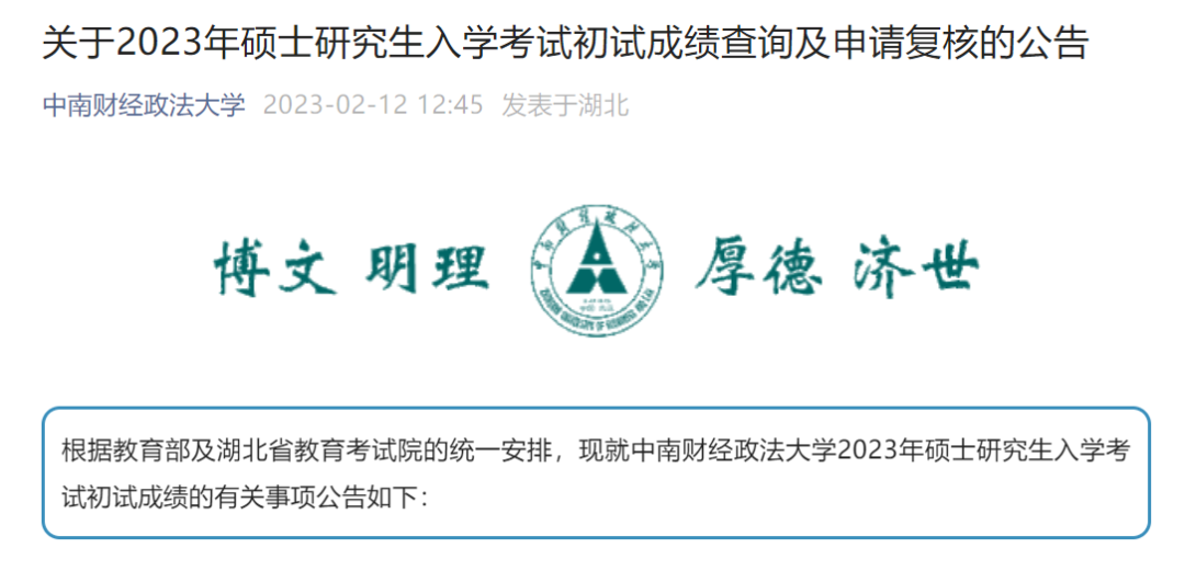 根据教育部及湖北省教育考试院有关安排,武大2023年硕士招生考试初试成绩计划于2023年2月22日9时开通查询。如考生对本人成绩有疑问,可于2月22日16时-2月26日16时前通过武汉大学研究生招生服务平台进行网上申请复查成绩(网址:http://yz.whu.edu.cn),逾期不再受理。