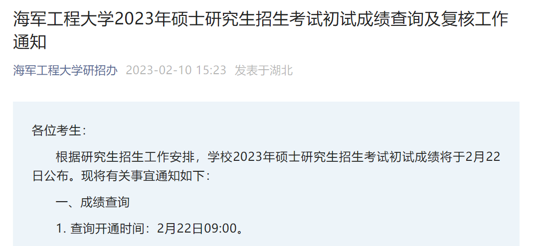 根据教育部及湖北省教育考试院有关安排,湖北文理学院2023年硕士研究生招生考试(初试)成绩发布时间为2月22日9点。考生如对成绩有异议,可申请复查。受理时间2月22日-26日16:00,逾期不再受理。