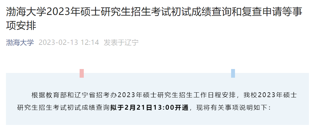 根据教育部和辽宁省招考办2023年硕士研究生招生工作日程安排,渤海大学2023年硕士研究生招生考试初试成绩查询拟于2月21日13:00开通。成绩复查受理时间为2月21日-2月23日17:00,逾期不再受理。