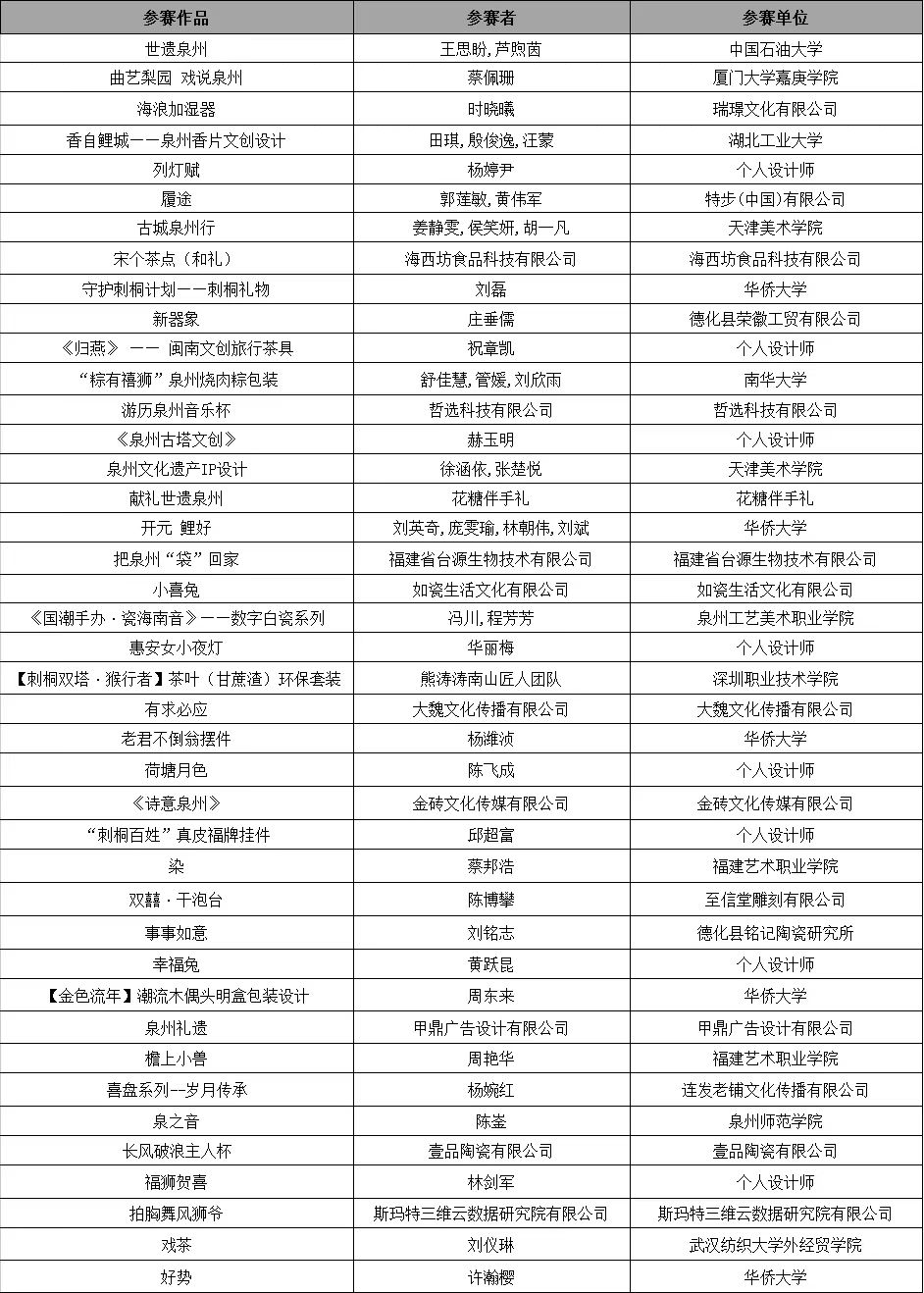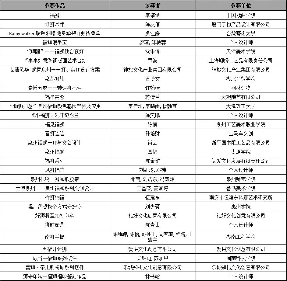 大赛以“世遗风华·狮意泉州”为主题,立足于对泉州城市文化内涵的深刻表现,致力于挖掘一批具有泉州独特地域文化特色、兼具艺术性与实用性的文创礼品,同步传承“福狮”文化,助力泉州城市形象的宣传与打造。大赛自2022年10月10日正式启动作品征集以来,受到社会各界的广泛关注和积极响应,共征集到全国参赛有效作品1239件,涉及921个设计团队。经7名专家评委专业评选,70件作品在初评中入围,入围作品名单如下: