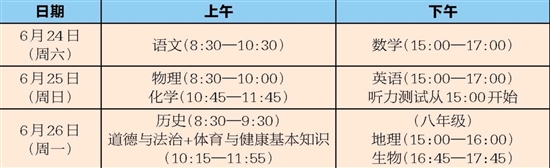 中考方面,今年仍实行初中毕业与高中阶段学校招生考试“两考合一”,考试成绩作为学生毕业和升学的基本依据。中考成绩总分与去年一致,为800分。语文、数学、英语、道德与法治、历史、地理、物理、化学、生物等9个科目及体育与健康基本知识考试实行省级统一考试,全部实行书面闭卷笔试形式。其中,道德与法治科目、体育与健康基本知识考试同场合卷进行。中考省级统一考试安排在6月24日—26日举行。