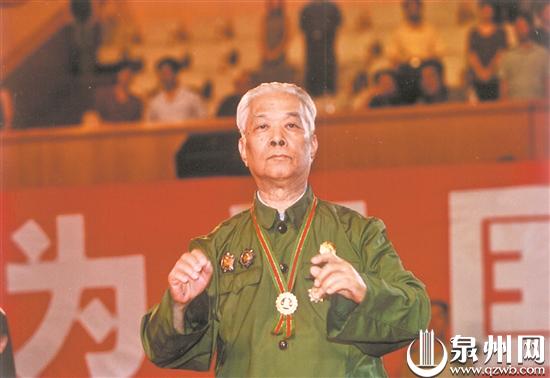 2002年7月,解放军军乐团成立50周年演出现场,82岁的罗浪指挥全场高唱国歌。