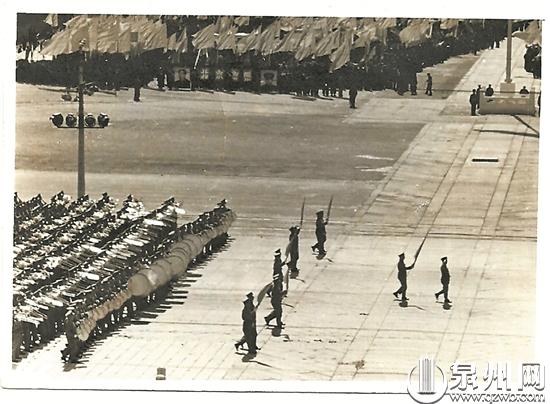 1951年国庆庆典,军乐团列队行进中,最前面敬礼者为罗浪。