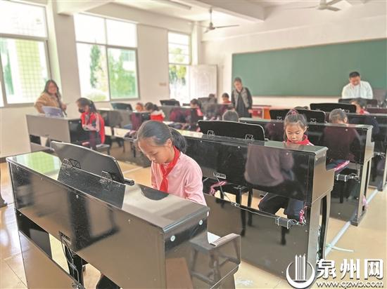 结合国家课后延时服务政策,周一下午是每周固定的课外兴趣小组活动时间,综合楼传出钢琴声、笛子声。在钢琴室,10多名学生坐在10架电子钢琴前,轮流练习。六年级的叶湉双手弹奏一曲《两只老虎》,她说:“家里没有钢琴,只能每周来练一次,很期待每周的钢琴课。”幼儿园老师兼钢琴课教师涂素娇说:“每周一下午一节课40分钟,加课后延时服务30分钟,这70分钟就是同学们每周练琴的时间。尽管曲谱简单,对于此前从未触碰钢琴的她已是很大的进步。这些钢琴为山区孩子们打开一扇通往音乐殿堂的大门。”