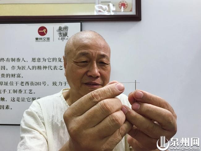 濠沟墘47号惟香堂主人李春生是泉州洛江非遗传承人,几年前来到濠沟墘开设工作室,已经“玩香”50多年,他制作的金丝线香细如发丝,能穿过针眼,堪称一绝。李春生介绍,泉州人燃香的历史悠久,与南音、梨园戏、五祖拳等一样,受宋朝皇族子弟南迁的影响,成为泉州人丰富多彩的生活一部分。据在档案馆查询的资料,上世纪四十年代,泉州古城内登记有29家以“前店后厂”模式制造批发香品的商号。从事香品行业的店铺达140多家。可见当年古城香品业十分兴旺。