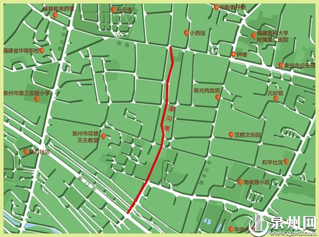 濠沟墘南起新门街,北抵西街,全长773米,曾是泉州市人民政府所在地,也是如今的鲤城区人民政府所在地,与整条中山中路平行,从南到北连接庄府巷、花巷、奎霞巷、通政巷、井亭巷支巷等,是古城中一条重要的交通古巷。