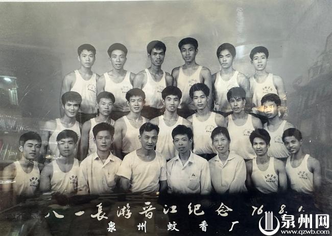 1976年的八一建军节,泉州蚊香厂员工在晋江游泳后的纪念。(李春生/供图)