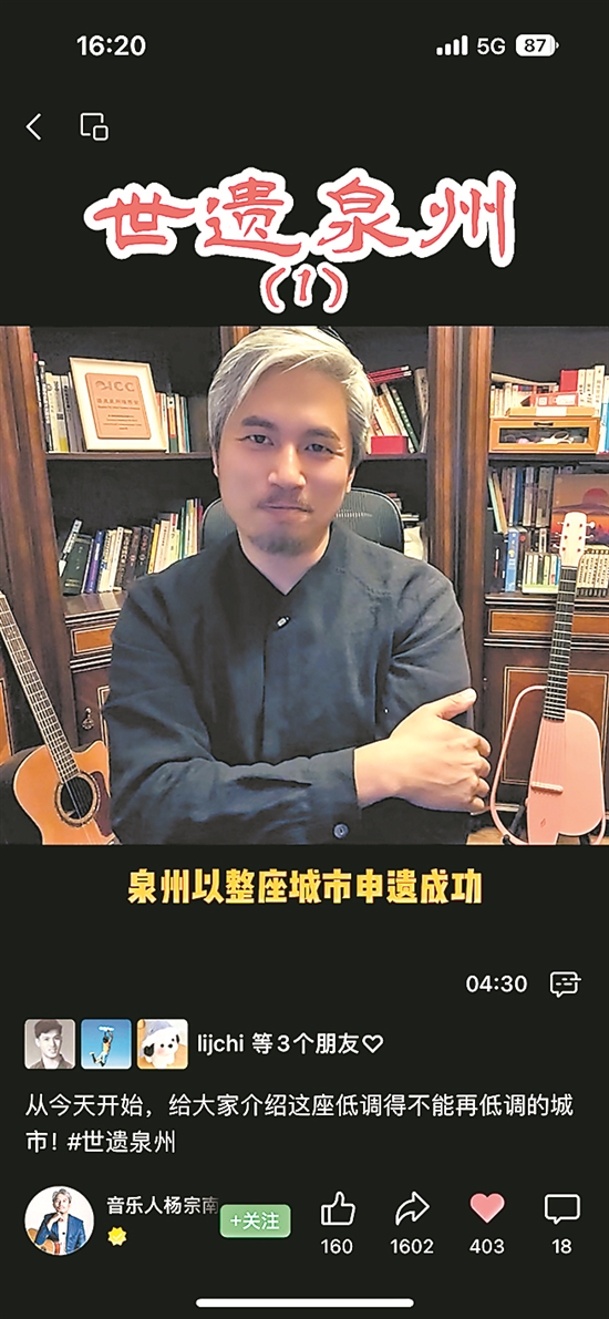杨宗南告诉记者,自己马上就要发布《世遗泉州2》,继续讲述泉州在宋元中国的地位。“对我来说,向世界推荐泉州是一种责任。”此前,杨宗南获得了“海丝泉州推荐官”“世遗泉州·海丝丰泽”文旅传播大使的称号,他决定利用工作之余的时间拍摄视频,讲泉州故事。