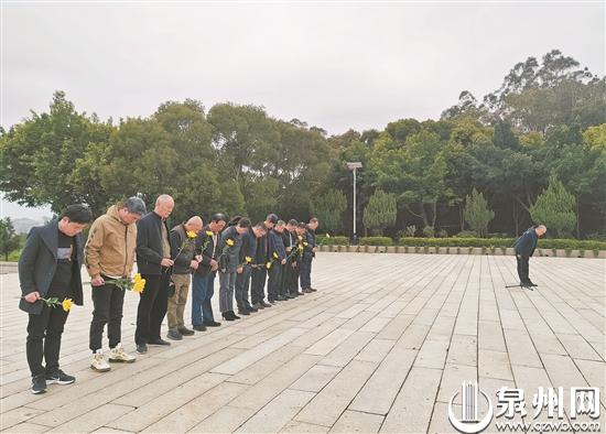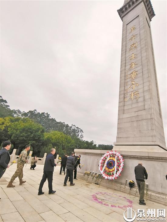 昨日上午9时30分,泉州市革命烈士陵园苍松环翠、庄严肃穆,前来缅怀革命先烈的一行人秩序井然地走上革命烈士纪念碑广场前的100多级台阶。在纪念碑前,众人排好队列向革命烈士纪念碑行鞠躬礼,随后在雄壮的国歌声中,向烈士默哀1分钟,最后众人依次上前瞻仰烈士纪念碑,并敬献菊花。