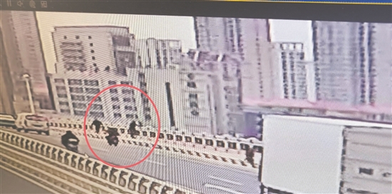 桥上监控视频显示,女子当时已经翻过护栏,整个人身体倾斜,作出要跳桥的姿势。千钧一发之际,陈浩彬冲上去死死抓住女子的双臂,出租车司机和另外2名民警也先后赶到,4人一起将女子拉回桥面。