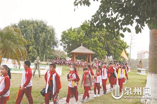 3月28日下午,晋江金井毓英中心小学五、六年级752名师生从学校出发徒步行至围头安业民烈士陵园开展清明祭扫活动。