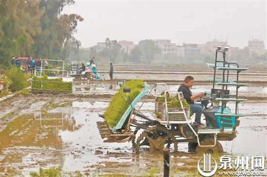 泉州网4月7日讯 (记者陈凌鹭 陈小阳 文/图)无人驾驶插秧机一小时插秧七八亩,农业无人机几十秒完成一亩农田施肥,侧深施肥机直播作业将水稻种子和化肥一起直接埋进地里……昨日,在石狮举行的泉州市现代农机促春耕生产现场会上,各县(市、区)农机发展中心负责人、种粮大户、农机大户、果蔬种植大户一同观摩农业生产新机具、新技术演示。