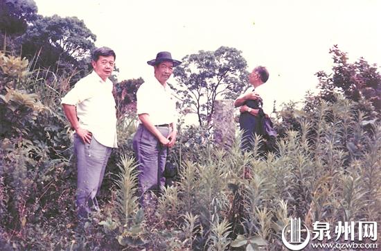 1990年,陈泗东(左二)等泉州文史界、新闻界人士深入紫帽山南麓踏勘。