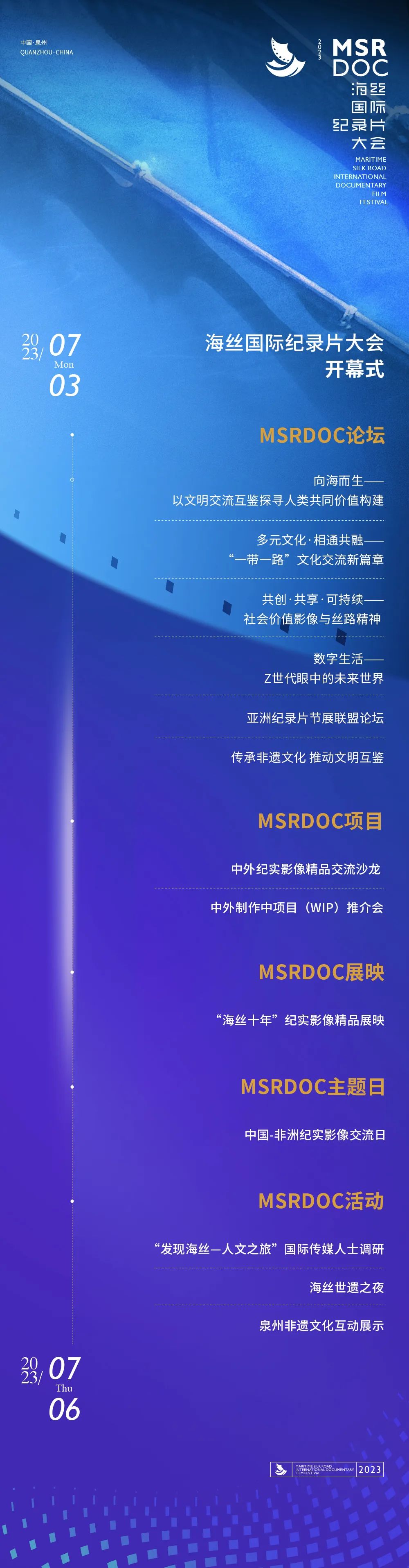 文明碰撞融合,繁衍生生不息。海丝国际纪录片大会继承海上丝绸之路所创下的海洋经济观念、和谐共荣意识、多元共生意愿,在新时代以国际纪实影像交流与合作的方式连通世界、促进发展,为海丝沿线国家和地区文明交流互鉴贡献中国智慧。7月3日-6日,福建泉州,期待您的到来!