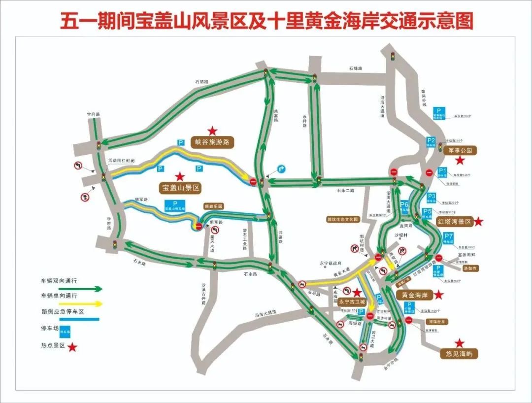 黄金大道、古卫大道、海湾路。黄金大道由西往东、古卫大道(黄金大道-海城路)由北往南、海湾路由北往南均实施单向通行。沿海大通道、红塔湾旅游路车辆前往永宁古卫城景区请绕行红塔湾旅游路→浯沙村路→永宁古卫城。上述单行路段严禁逆向行驶。