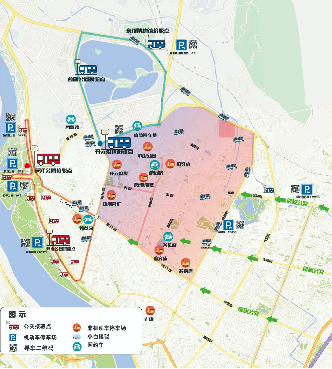 出租车、网约车请根据引导牌指示至芳草园、文化宫内停车场、城西路与西街交叉口、城北路泉州中旅汽车公司、中山公园-威远楼等地的网约车临时停靠点上下客。