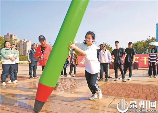 在泉港区直机关干部职工趣味运动会上,青年职工参与铅笔翻滚互动项目。(陈嘉纬 摄)