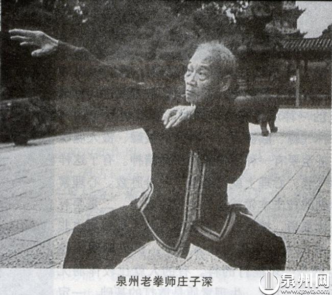 庄子深(1911—1996年),泉州普明村人。庄子深父亲庄九弓受业于泉州少林寺仰华大师,为清末著名武术团体“十二人社”成员。庄子深不仅自父亲和叔叔处习得花拳,还师承泉州侯君焕、福州郑忆山、山东曾毓卿、河北柴剑痴等名家,为泉州少林花拳一代宗师,亦是罗汉拳、犬地躺术、道派尼姑柴家太极拳的传人。庄子深的中医骨伤技术也独树一帜,其所创办的正骨风伤诊所、普安堂药房是西街有名的医馆,融合医武骨伤,屡创独特疗法和丸、散、膏、丹等秘方,一些中成药甚至远销东南亚各国。