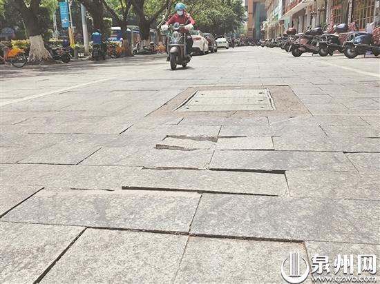 记者走访调查发现,这些主干道的人行道上,除了出现砖块松动、缺失的情况,有些路面已经变得凹凸不平。昨日上午,记者在泉秀街及田安路走访时,看到了市政工作人员正在修补个别地砖破损严重的区域。据了解,市政部门针对路面局部塌陷、破损、网裂,人行道板破损、缺失,以及检查窨井盖周边路面破损、路缘石松动、路灯不亮等问题,“发现一处、修复一处”,但一些非机动车道的石板材因泡水、车辆碾轧等极易反复出现松动、破损、缺失等情况。