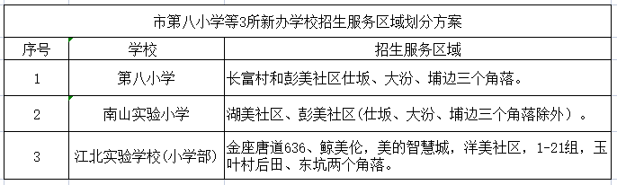 自2023年秋季起,市第八小学、南山实验小学、江北实验学校(小学部)3所新办学校起始年级均按划分服务区域招生。