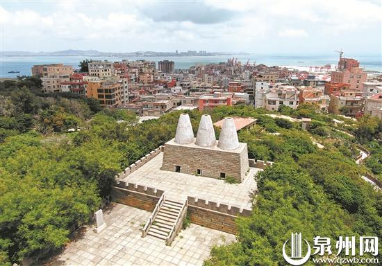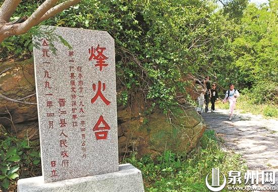 石璧山上密布着各类民居以及寺庙建筑,这些新旧交替的建筑物沿着山势绵延数里,远远望去宛若山城。邻里之间,笑语共闻、炊烟相接,颇富地方风情。来到主峰碧峰岭的古道上,蓦然遇见道旁立有一方“烽火台”遗址保护碑,据碑文所载,深沪烽火台遗址也已于1991年4月被列为晋江文物保护单位。从保护碑再经一个转角,即可见烽火台的“庐山真面目”了。烽火台原分上、下两层台墩,台墩由条石及三合土混筑,上筑三支“土筒”(今为开口的圆锥形烟囱),下设三个灶口。古时遇敌情,即于此处放烟或举火为号示警。白天放烟叫“燧”,夜间举火叫“烽”。烟墩守军能以“燧”“烽”准确传递军情,而且十分迅速。现今烽火台还建有三层石埕。抗日战争期间,烟墩三支“土筒”曾被日寇军舰炮轰炸毁其中一支。20世纪末旅菲侨胞捐资重修,解放军总参谋长杨成武将军为之亲题“烽火台”三字。而今,“烽火台”三字碑立于第二层石埕内。