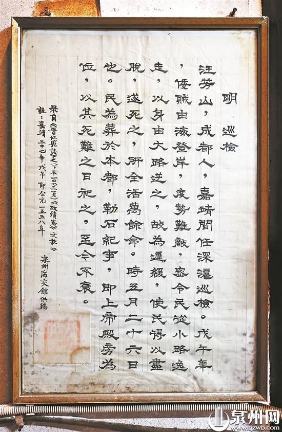 深沪城隍公宫汪芳山神位旁,有录自《晋江县志》的汪芳山介绍文字。