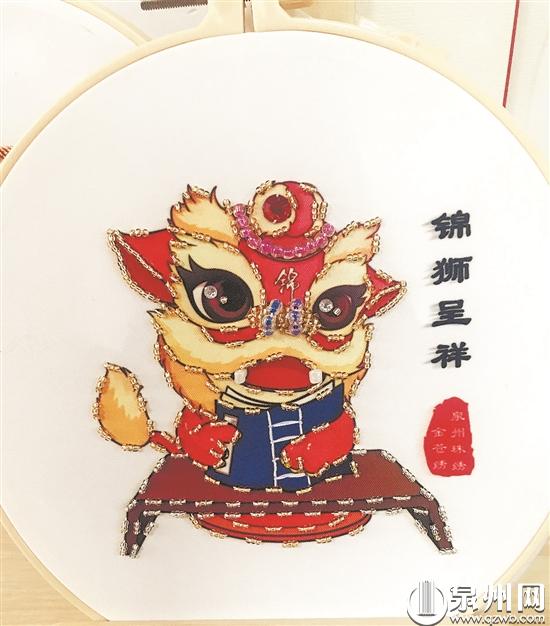 以“彩甲”为狮身,用“银片”做狮掌,将珠石拿来“勾勒”鬃毛、狮尾……在泉州,这一“珠光宝气”的瑞狮形象,常能在传统珠绣作品中寻到。除了由能工巧匠绣制的传统狮纹图样之外,如今,随着泉州珠绣技艺开始走进众多院校,不少师生在传承技艺、学习创作的过程中,也尝试将趣味、时尚、实用等元素融入以“狮”为题的绣品中,赋予传统珠绣更多活力,使其更符合现代人的需求和审美。