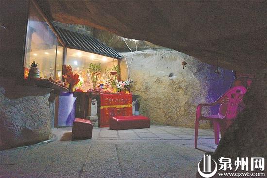 石洞内部面积十多平方米,供奉着何氏九仙及范候公的神龛,洞内青灯闪烁,凉风习习,边上的小床,就是供人祈梦的。