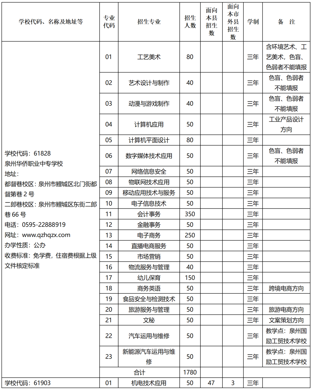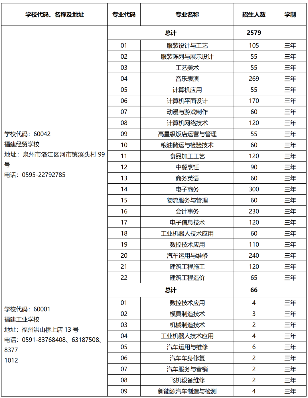 2023年泉州市中等职业学校(三年制)招生计划