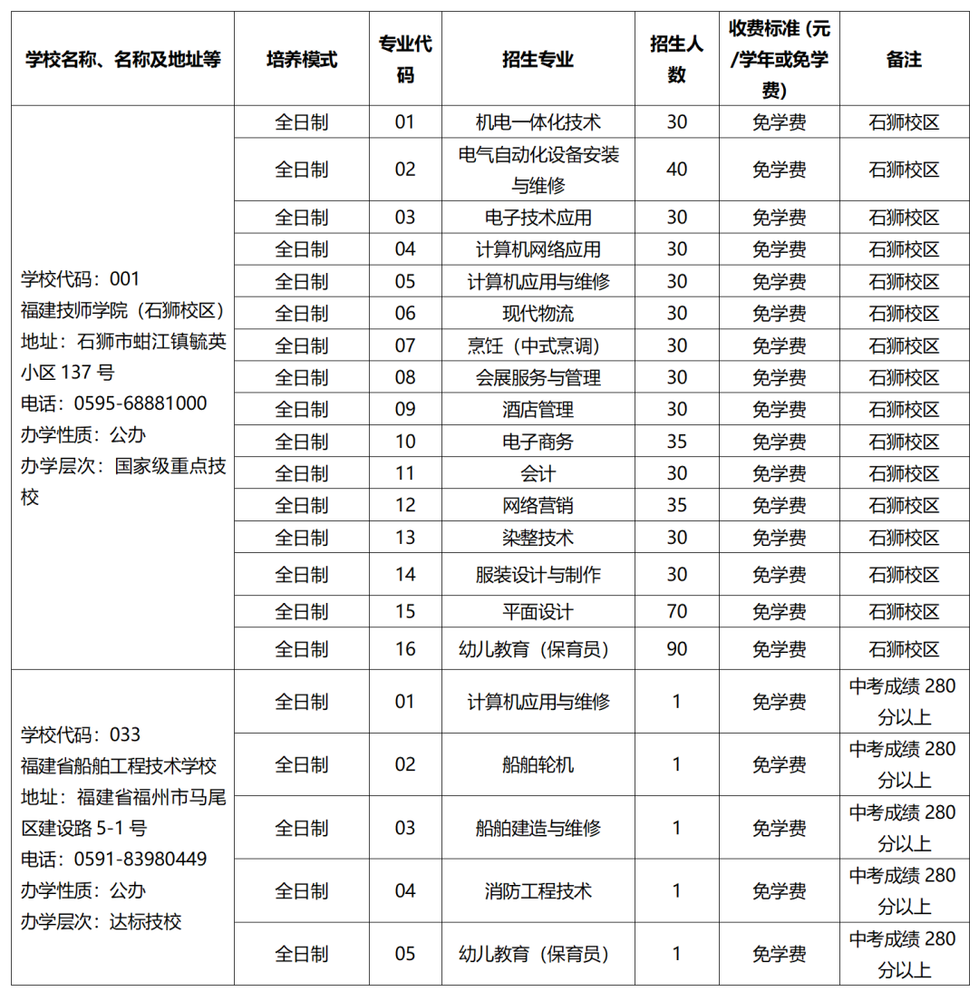 2023年省属中等职业学校面向泉州招生计划