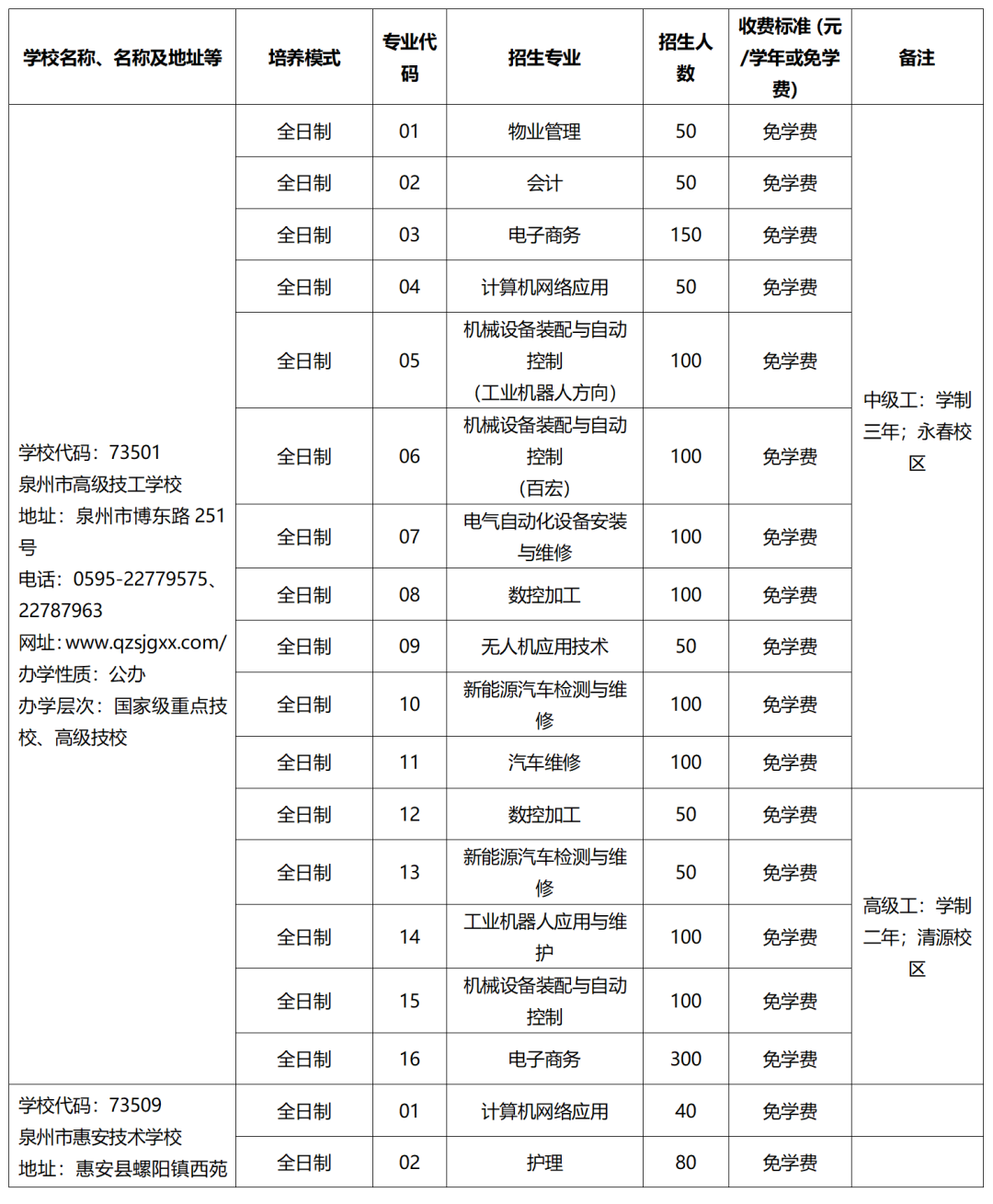 2023年泉州市技工院校招生计划