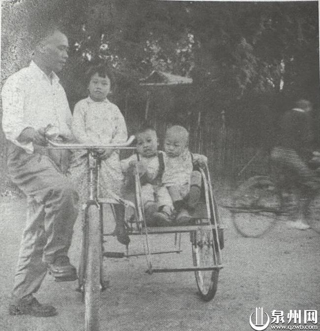 1954年,在缅甸曼德勒,林竹用三轮车载着林燕婴、林平原、林中原。(据《百年家事》)