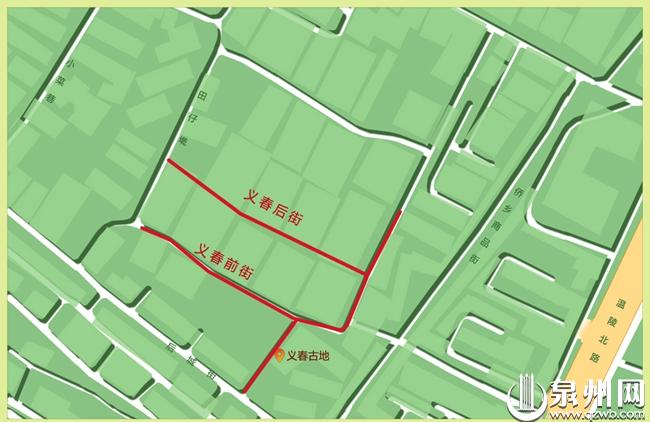 泉州鲤城区义春街,北接礼让巷,南抵后城街,西侧分为义春前街和义春后街,与田仔墘巷相交。义春街属于古城南隅三教铺义春境,此处位于古代泉州罗城7个城门之一的迎春门(即通淮门)内,建有义春宫,因此而得名。“义春”在几十年前曾更名为“宜春”,如今街边门牌已经恢复成“义春”,只有在住宅小区中仍使用“宜春”的名字。