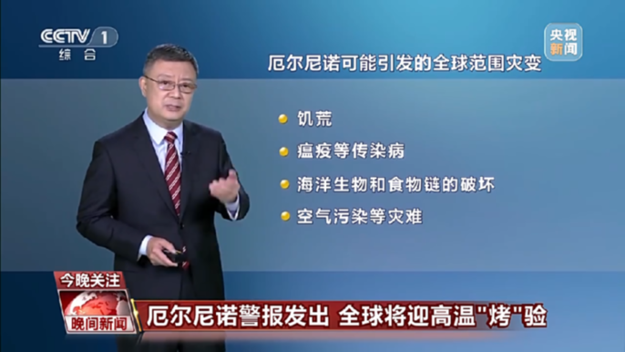 中国气象局正研级高级工程师 朱定真:对全球而言,有可能引起大面积的饥荒,许多地方原来是雨水充足的,但是出现了这种干旱,甚至于出现更多的病虫害,造成瘟疫的传播;海洋上海水冷水的翻滚,和热表面分布的完全颠倒的变化,也会造成海洋生物和食物链的破坏,当然还有人分析说,在厄尔尼诺年,因为它会相对偏暖,干旱比较多,这些干旱少雨区域的森林和草原的火灾就会比较多,这时候造成的飘起物,就会对我们的健康造成污染和影响。