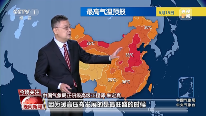 中国气象局正研级高级工程师 朱定真:现在从中央气象台预测来看,也就是十五、十六日的时候,因为暖高压脊发展是最旺盛的时候,所以这一些大片的区域,就是华北和黄淮地区会出现大片的35℃以上的高温,但是随着这个暖高压脊的逐渐东移,所以整个的高温区域也会有一个逐渐的一个缩小过程。