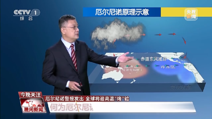 中国气象局正研级高级工程师 朱定真:对于厄尔尼诺来讲,实际上是特定海区里比平常海温要偏高的一个现象。在常规下,气流是旋转的,在这个地方上升成雨,而另个区域下降,相对天气比较晴好。出现了厄尔尼诺以后,上升成雨的区域和下沉区域就会发生改变,所以造成一定区域气候的紊乱。