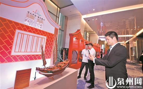 欢迎晚宴设立非遗体验区,邀请妆糕人、珠绣、福船等非遗传承人现场展示和制作。图为福船模型吸引侨商参观拍照。 (林劲峰 摄)