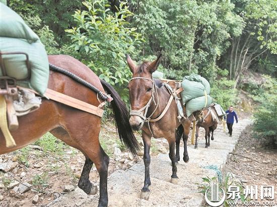 泉州网6月15日讯(记者 陈灵 黄耿煌 通讯员 黄小燕)“走!”在赶骡人夏雨的指令声下,驮着上百斤石块、沙袋的骡子沿着石阶一路上山。这是它们在天马山运送货物的最后一趟。13日,南安英都良山村村民自筹自建项目——天马山休闲步道完工。